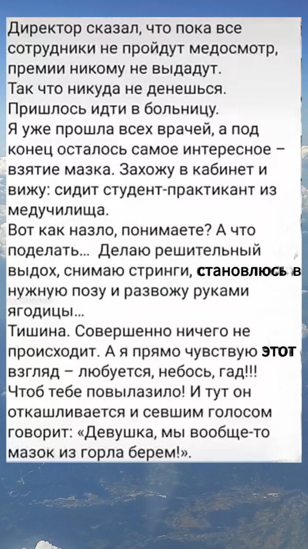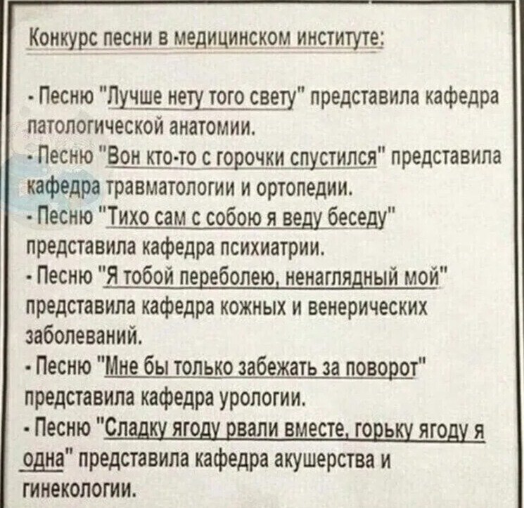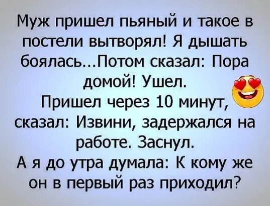 zloypapa 23 620 Жалоба Опубликовано 18 Октября Лежит больной в предоперационной. В дверь стучит медсестра, спрашивает: -Можно к Вам? Потом быстро подходит, сбрасывает одеяло, снимает с больного трусы, намыливает его хозяйство, быстро бреет, ловко переворачивает парня на живот и вставляет в задницу обезболивающую свечку. Обалдевший парняга мычит скромно: - Спросить м-м-могу? - Всё что угодно... - А на какой хрен ты стучалась??? 5 1 Цитата Поделиться этим сообщением Ссылка на сообщение