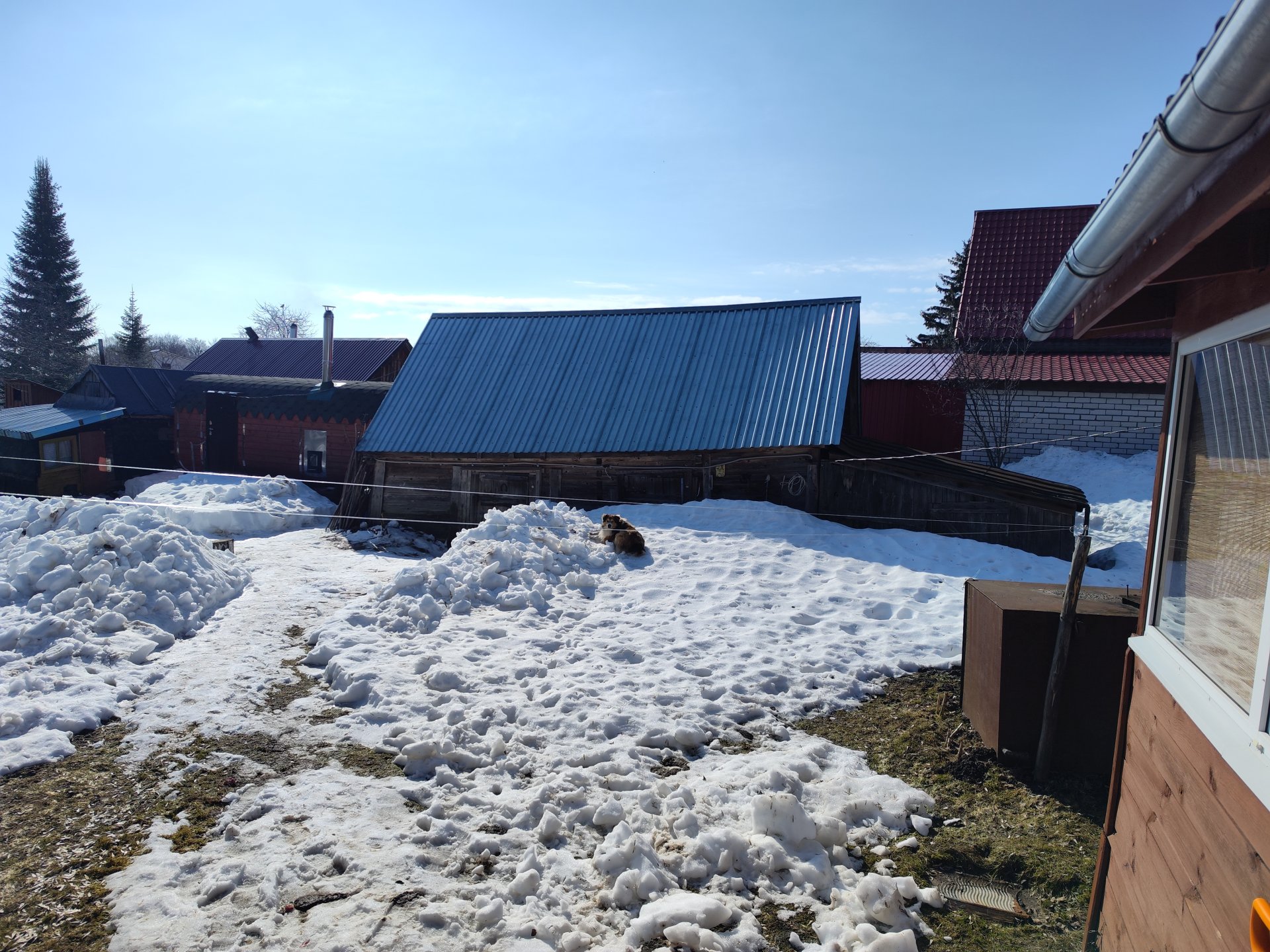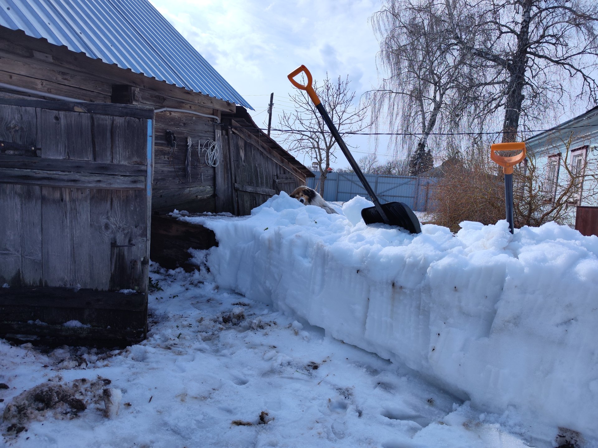 В Павловском районе в огороде почти чисто. Редкие минисугробики напоминают о глубоких сугробах. Только между домами снег лежит. Но там прилично с двух крыш съехало. Выше ворот сугроб был)) Водосточку в этот год в первый раз сломало. Вырвало и выгнуло.