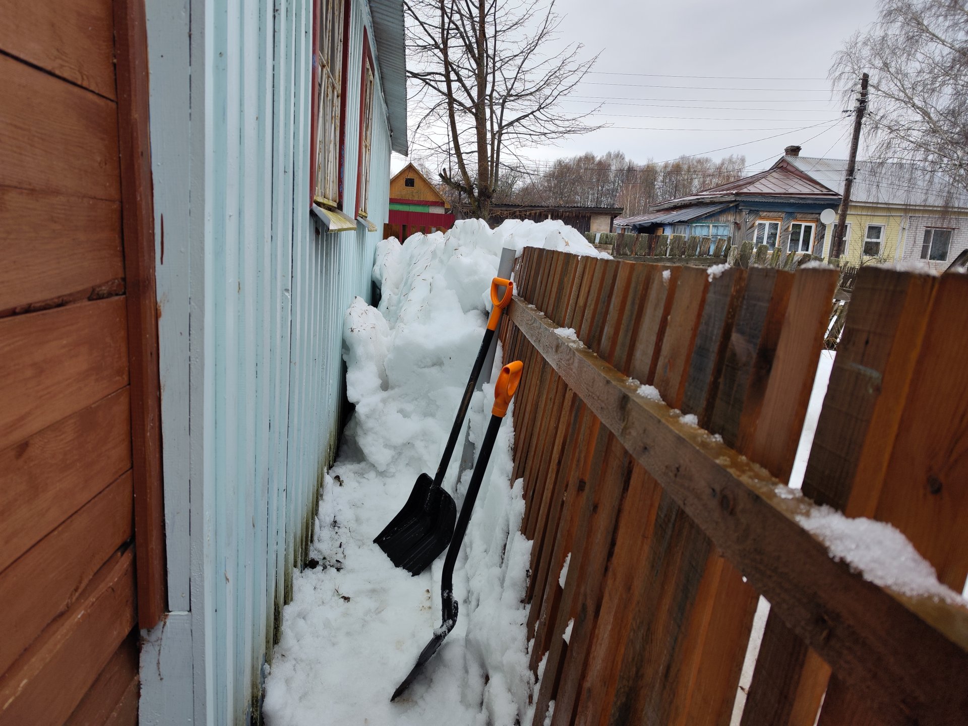 Никогда на моей памяти ни дед, ни родители, ни мы снег с крыши не сбрасывали. Но после того, как пару лет назад снег с дома сполз на сени и продавил крышу, она висела буквально на буфете, решили без внимания это дело не оставлять. Думаю, в сенях окна полностью под снегом.